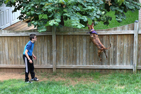 Canon EOS Rebel T4i. Bandit is my daughter's rescue dog. She loves to play with the kids, enjoy companionship, and trying to get to the dog next door. The jump here was one of the most common things you'll see of her outdoors. I chose this particular frame because (in spite of not seeing her face) it is totally her.